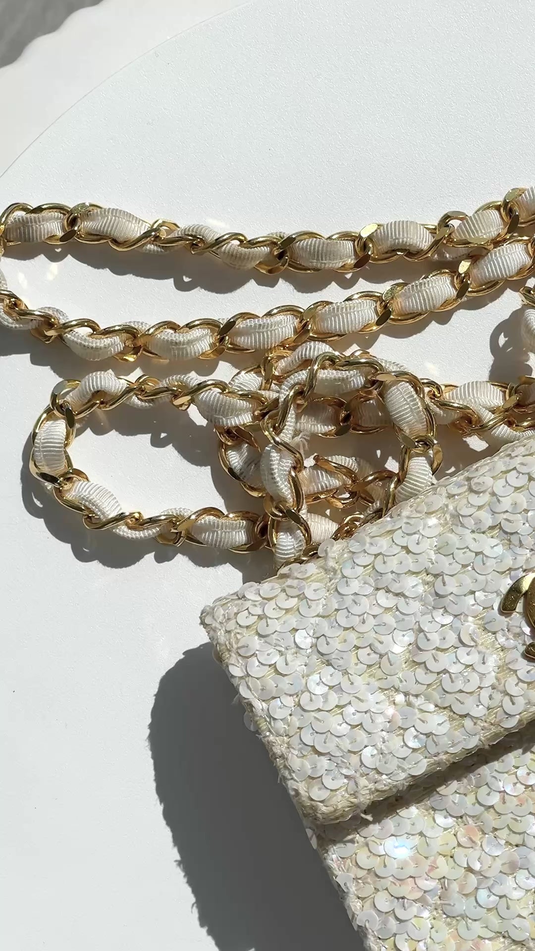 Chanel Vintage S/S 1991 Iridescent White 24K Gold Sequin Micro Mini Flap Bag